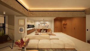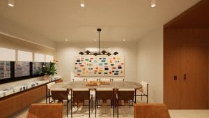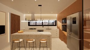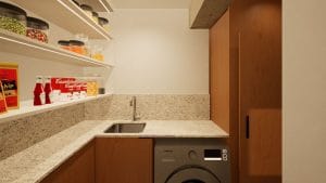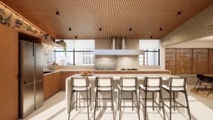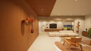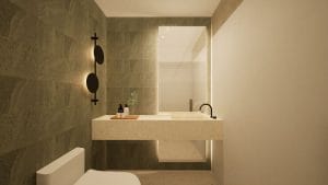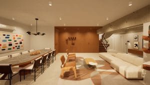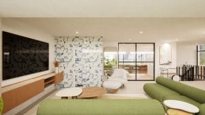 No primeiro pavimento, a distribuição inteligente valoriza a praticidade e o bem-estar, com uma cozinha funcional, lavanderia, três suítes espaçosas e salas de jantar e TV que recebem iluminação natural.