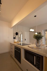 Observação: Decoração cenográfica com móveis, tapetes, decorações e eletrodomésticos (geladeira, forno, cooktop, lava louça e microondas cenográficos), para melhor visualização de como os espaços poderão ser utilizados.