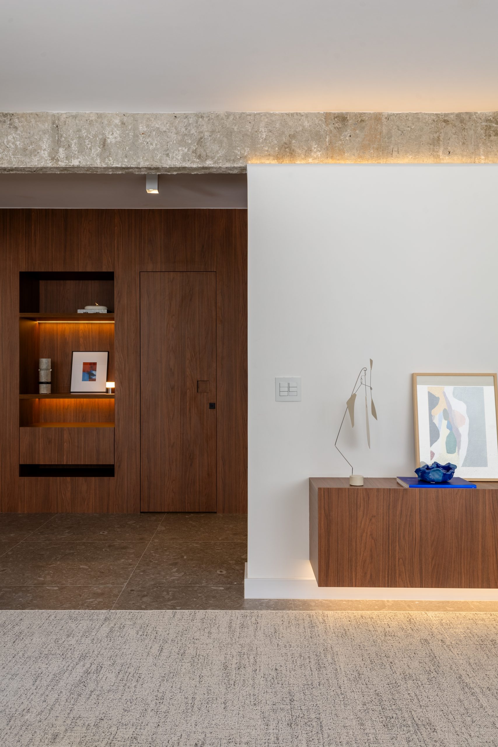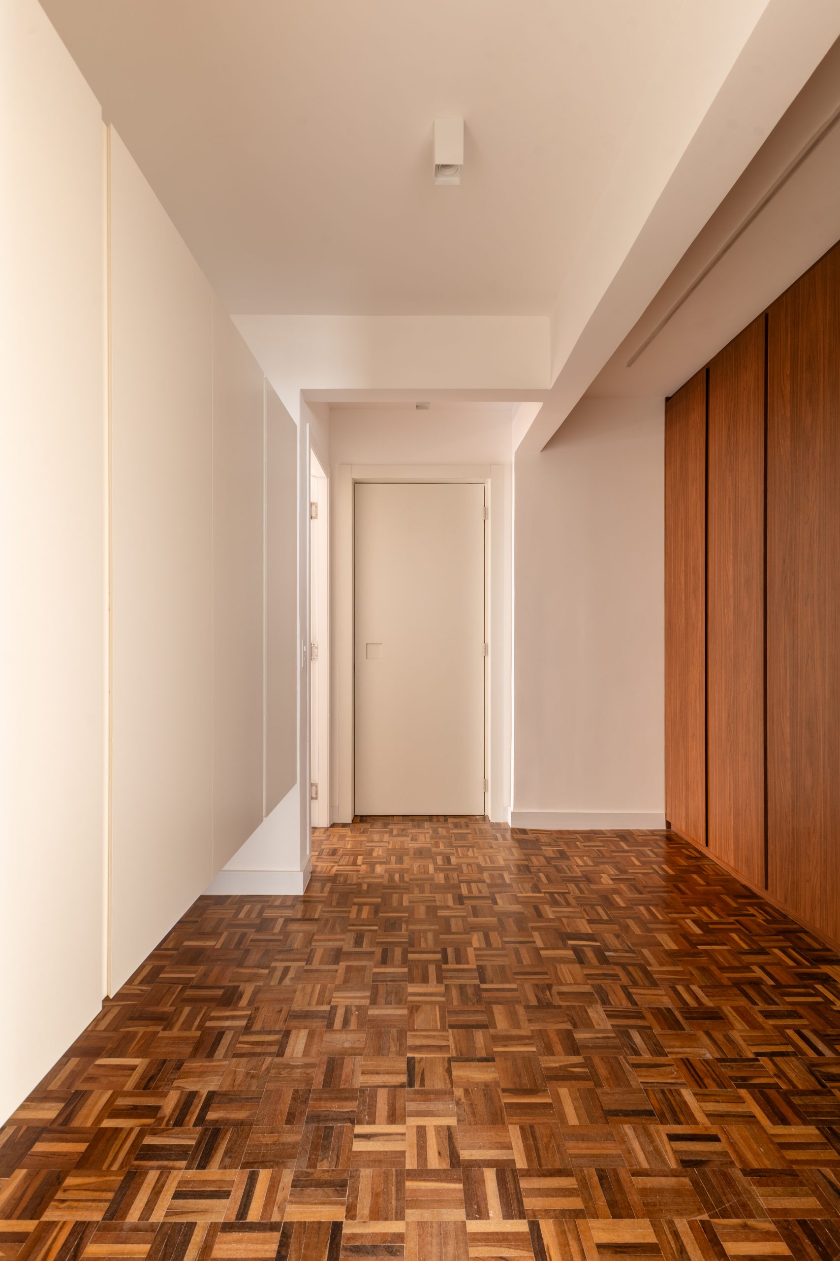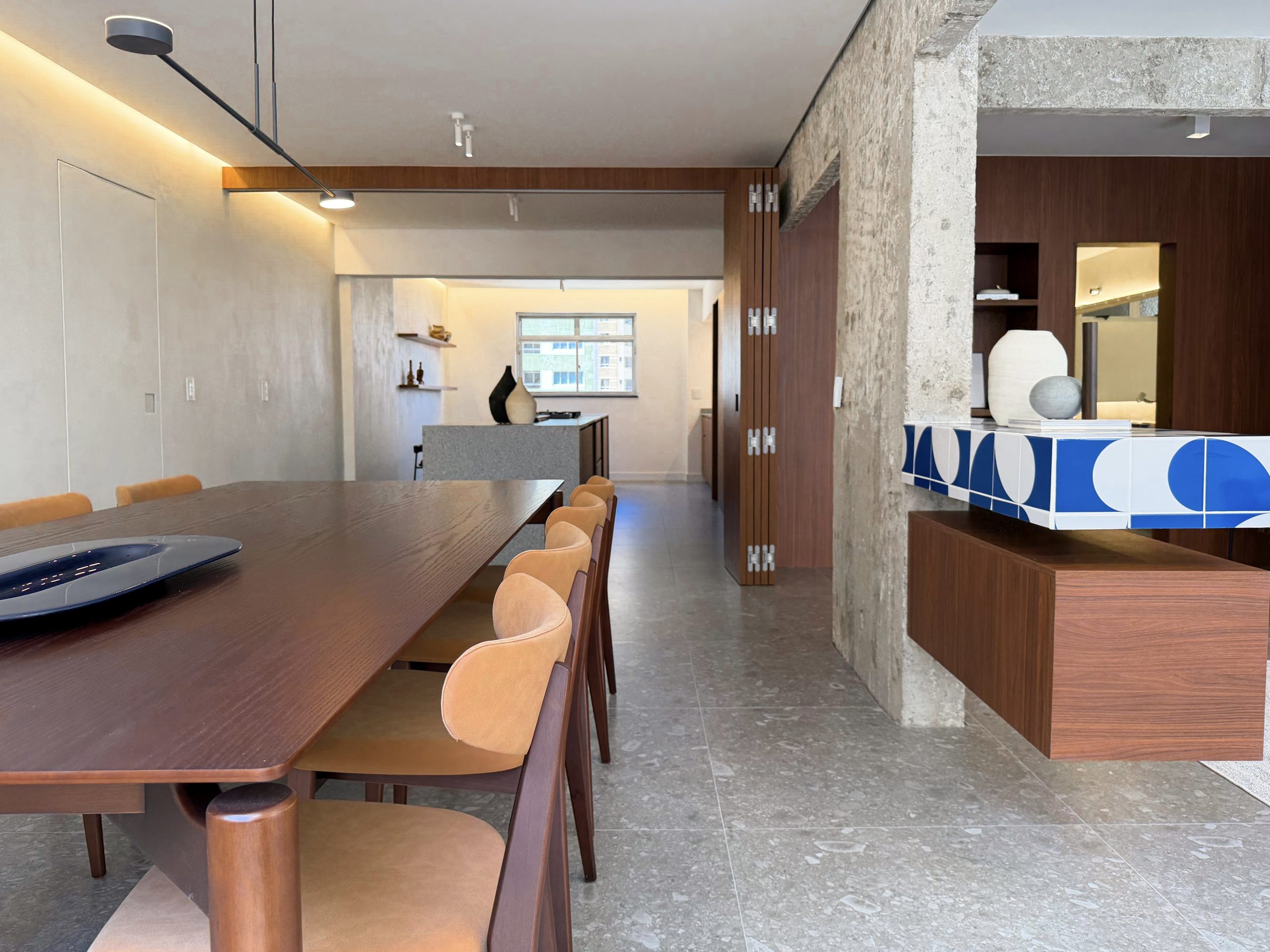 - Como o retrofit transformou esse apartamento?: Instalações elétricas e hidráulicas totalmente renovadas, Readequações de projeto para trazer mais amplitude e integração entre os ambientes, proporcionando mais conforto e funcionalidade, Novos revestimentos. Louças, metais, marcenaria, tampos em pedra, luminárias e portas