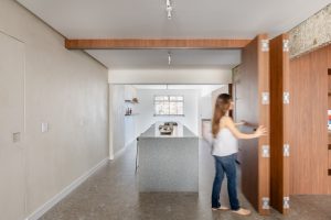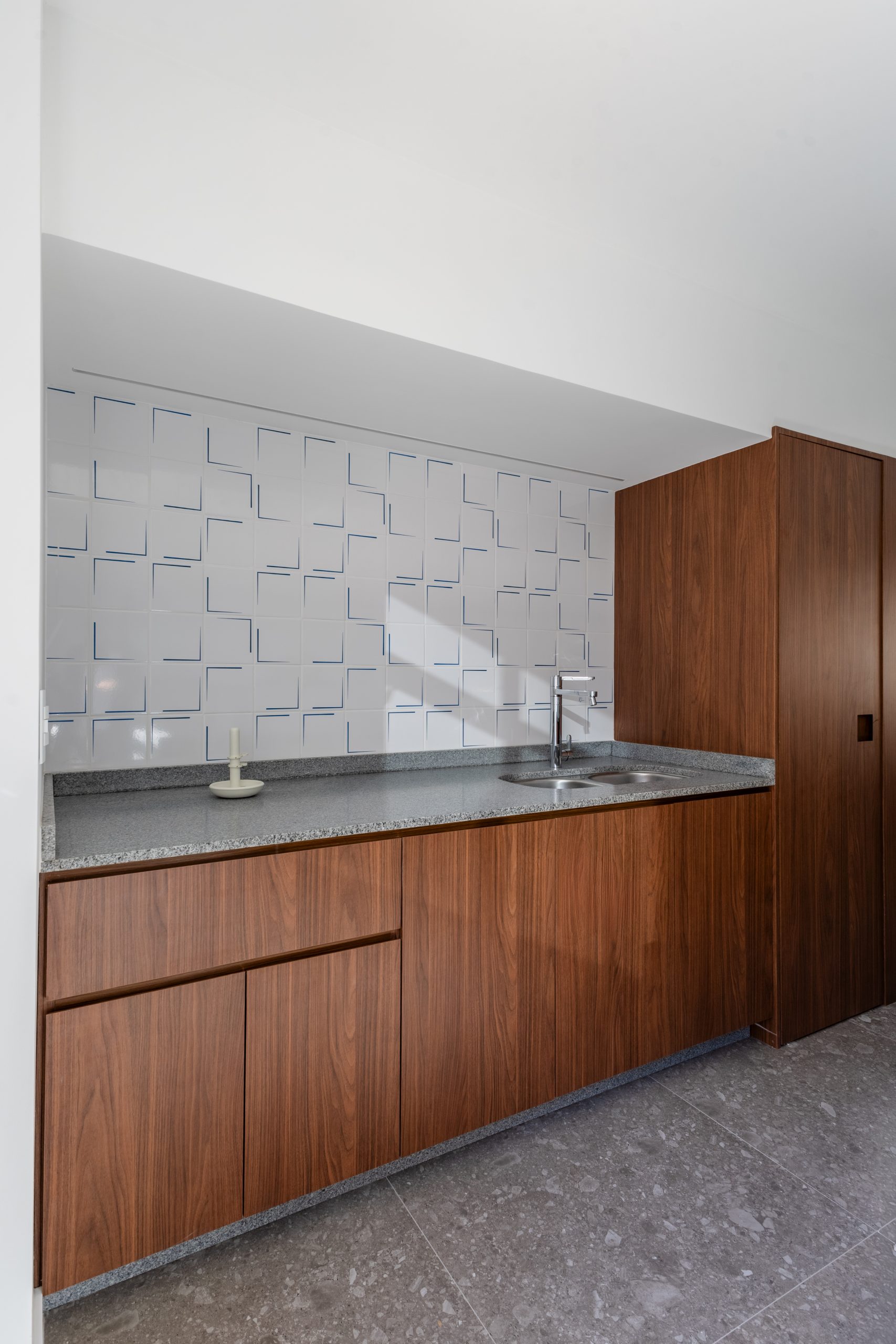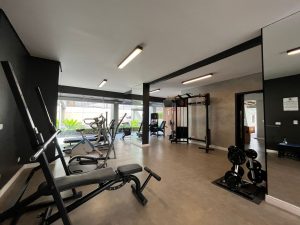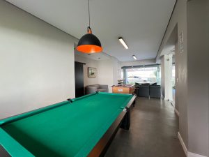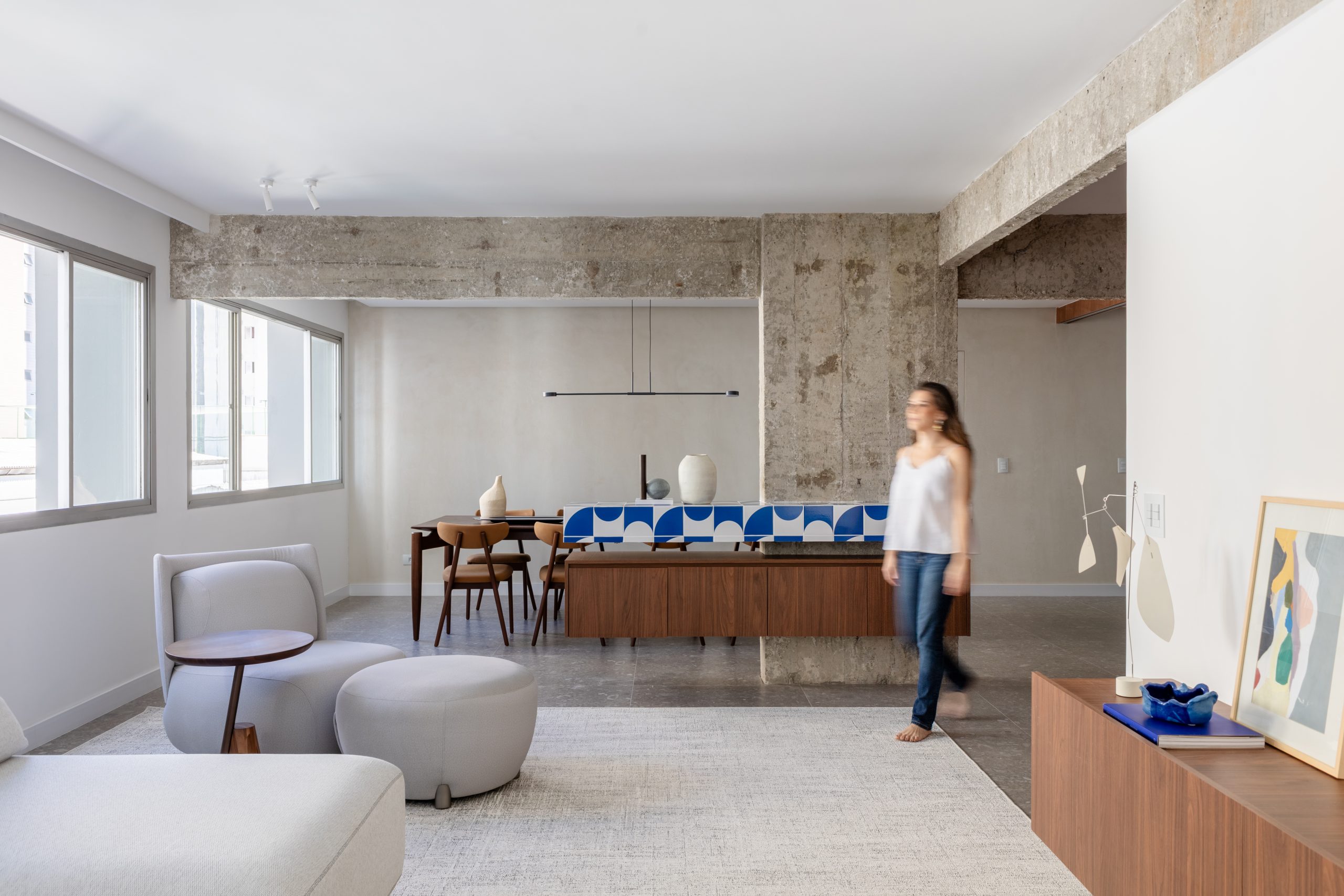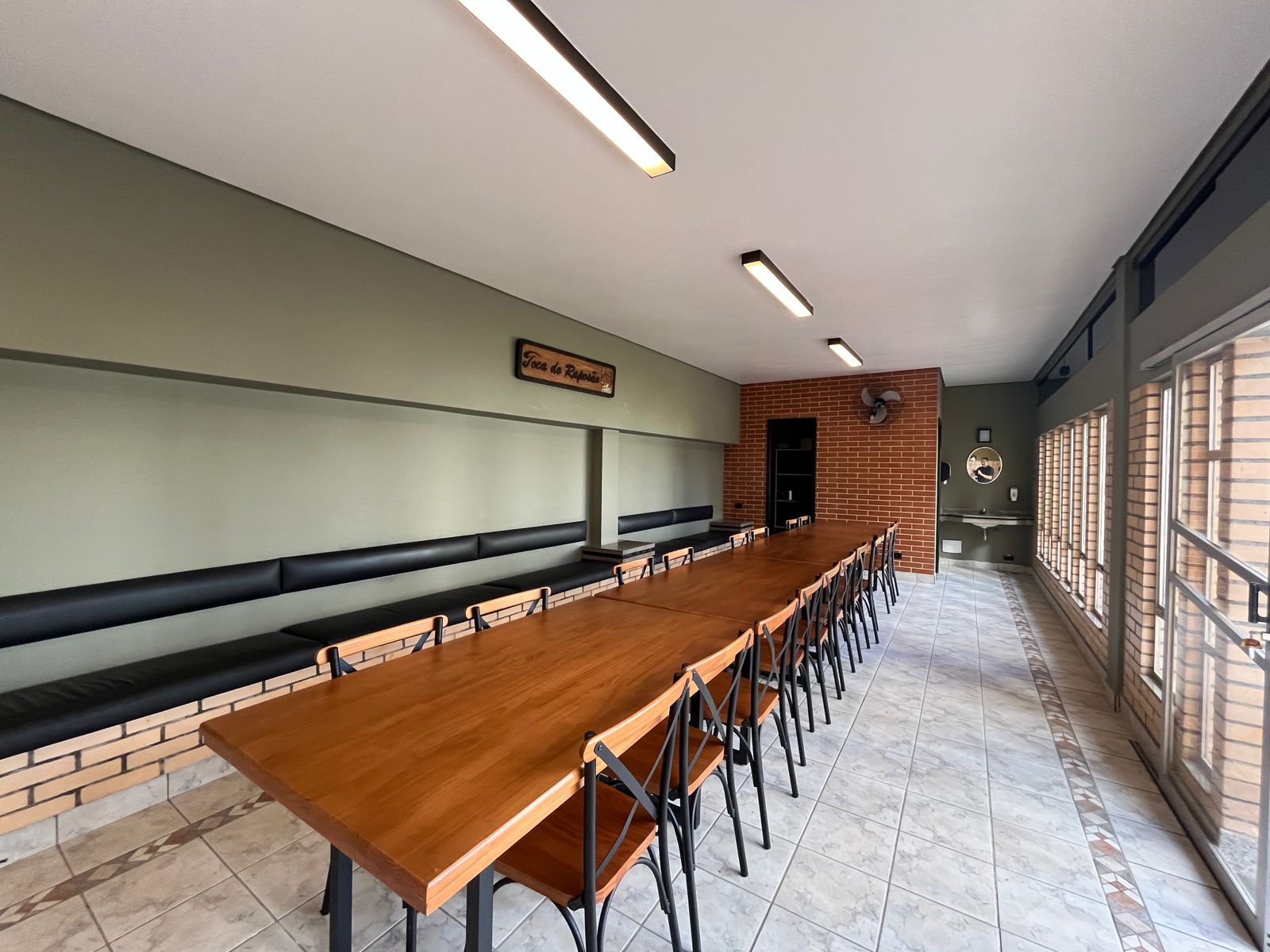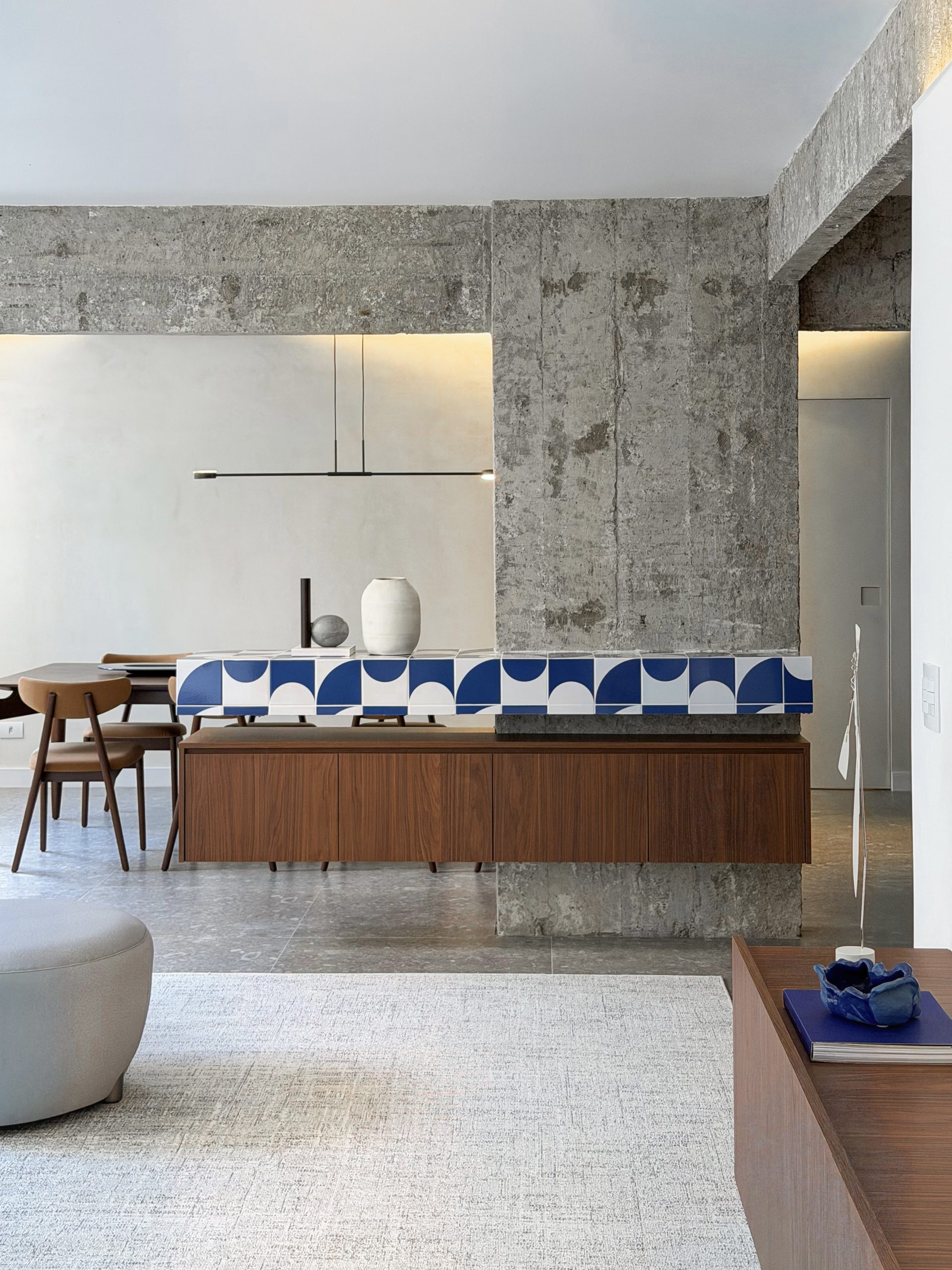 O projeto assinado pelo escritório BAUHA Arquitetura prioriza a integração dos ambientes sociais. Logo na entrada, sala de estar e jantar se conectam à cozinha, equipada com ilha central, marcenaria planejada, marmoraria, cooktop novo e espaço para churrasqueira gourmet — ideal para receber. Toda a área social conta com novos revestimentos e marcenaria sob medida, além de um lavabo.